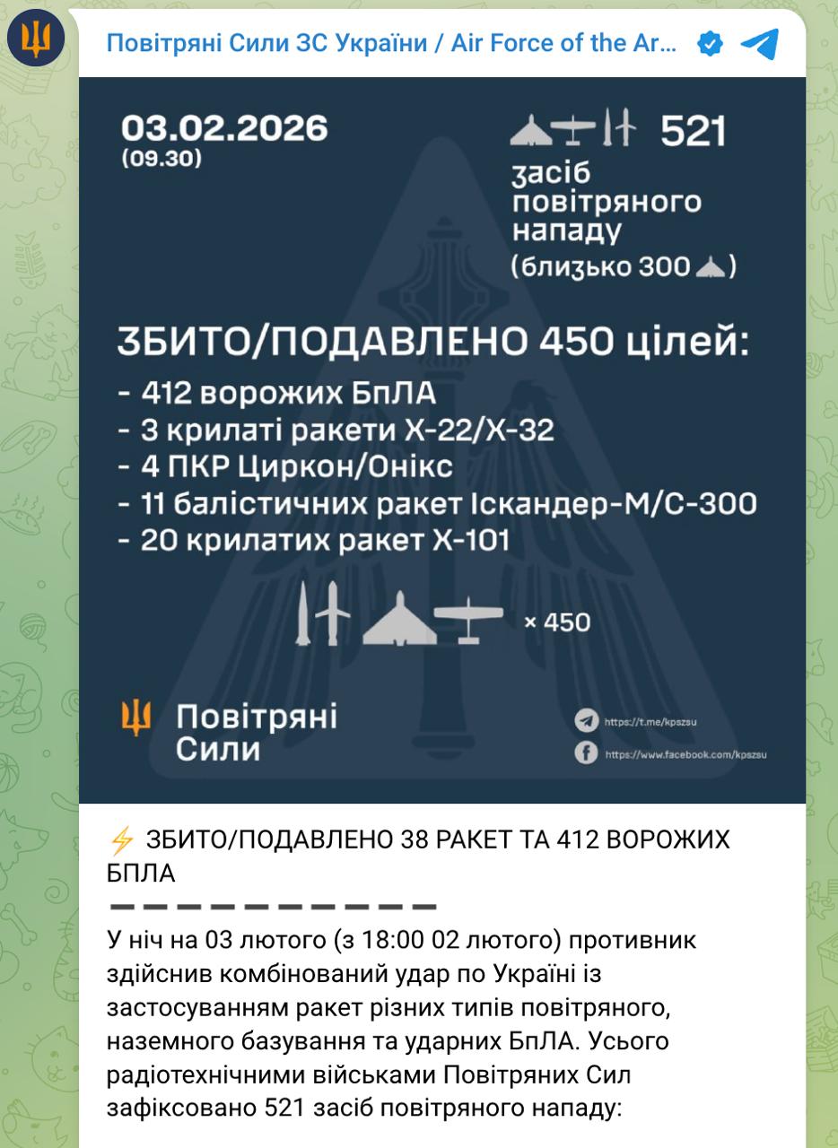 9.30 РФ этой ночью выпустила по энергетике Украины более 70 ракет, в том числе большое количество баллистических, и 450 БпЛА, сообщает Зеленский.