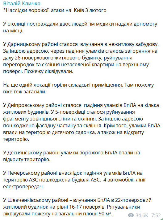 В ночь на 3 февраля армия РФ обстреляла Киев.