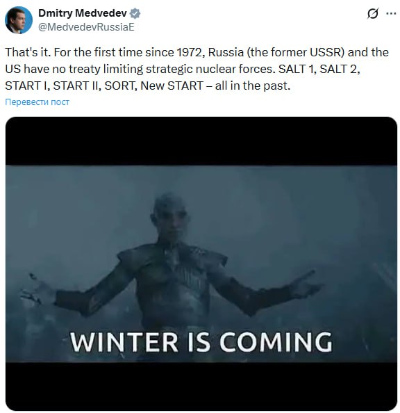 К своему посту Медведев добавил мем из сериала "Игра престолов" с подписью "Зима близко".