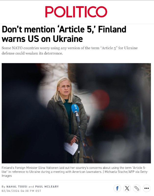 "Валтонен предостерегла от любых предложений о гарантиях безопасности для послевоенной Украины, подобных статье 5... Она предупредила, что это может привести к смешению гарантий НАТО по статье 5 с двусторонними обязательствами перед Украиной", - сообщило издание со ссылкой на корреспонденцию Госдепа.