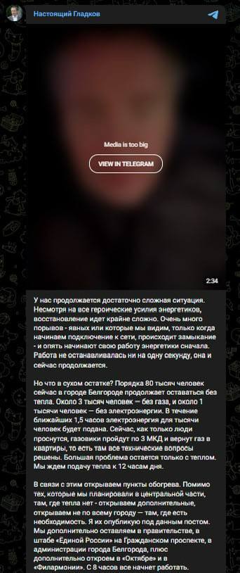 11:46 Губернатор Белгородской области Гладков заявляет о том, что в городе после вчерашних обстрелов на сегодняшнее утро около 80 тысяч человек оставались без тепла, три тысячи без газа, тысячу без света.