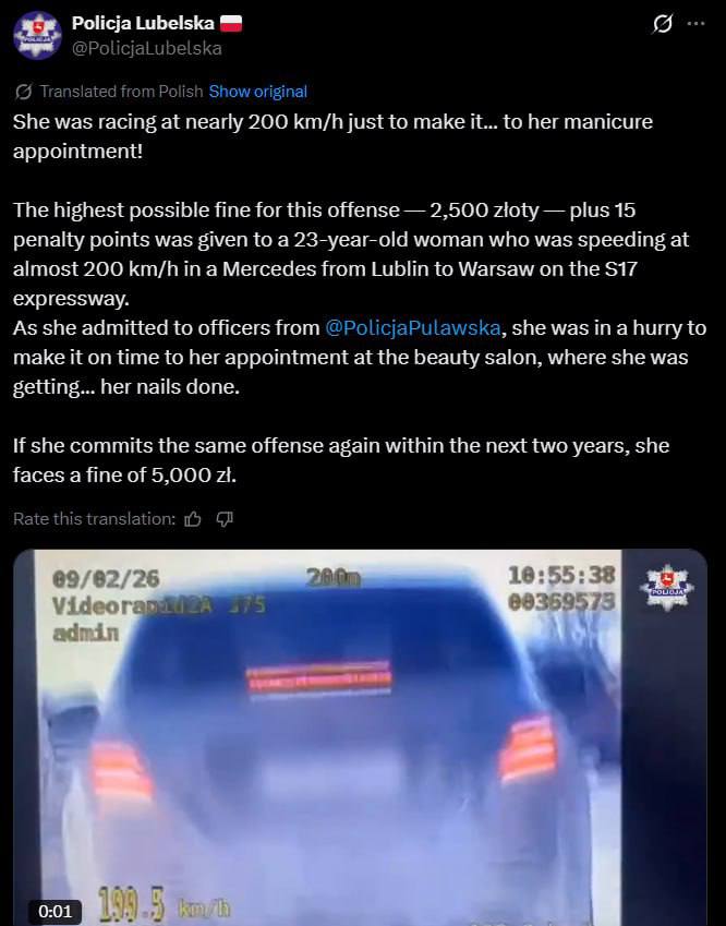 Записи с полицейских видеорегистраторов подтвердили, что девушка ехала на автомобиле Mercedes почти 200 км/ч при установленном на данном участке дороги ограничении скорости 120 км/ч. В официальном заявлении полиции приводится пояснение девушки, которая заявила, что ехала со скоростью 200 км\час из-за того что спешила из Люблина в Варшаву в салон на маникюр.