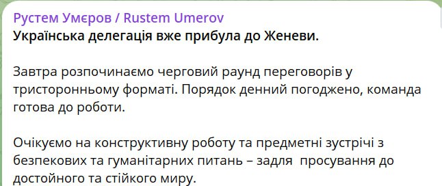 Об этом сообщил глава делегации Украины, секретарь Совета национальной безопасности и обороны (СНБО) Рустем Умеров в своем телеграм-канале.
