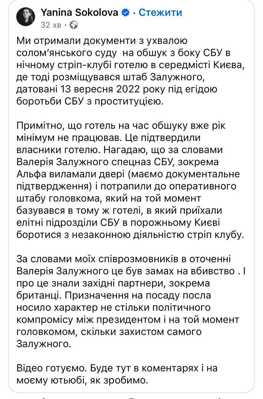 "Примечательно, что отель на момент обыска уже как минимум год не работал. Это подтвердили владельцы отеля. Напомню, что, по словам Валерия Залужного, спецназ СБУ, в частности "Альфа", выломали двери (имеем документальное подтверждение) и попали в оперативный штаб главкома, который на тот момент базировался в том же отеле, в который приехали элитные подразделения СБУ в пустом Киеве бороться с незаконной деятельностью стрип-клуба. По словам моих собеседников в окружении Валерия Залужного, это было покушение на убийство. И об этом знали западные партнеры, в частности, британцы. Назначение на должность посла носило характер не столько политического компромисса между президентом и на тот момент главкомом, сколько защитой самого Залужного", - написала Соколова.