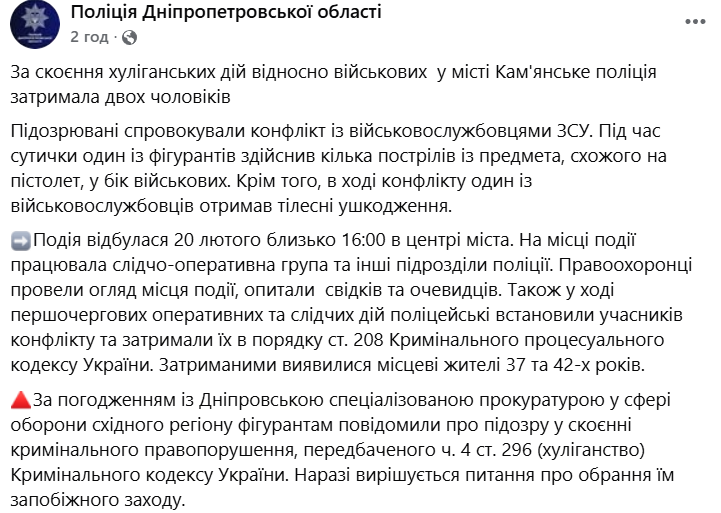 В полиции сообщили, что инцидент произошёл 20 февраля около 16:00 в центре города Каменское. На месте происшествия работала следственно-оперативная группа и другие подразделения полиции. Правоохранители провели осмотр места происшествия, опросили свидетелей и очевидцев.