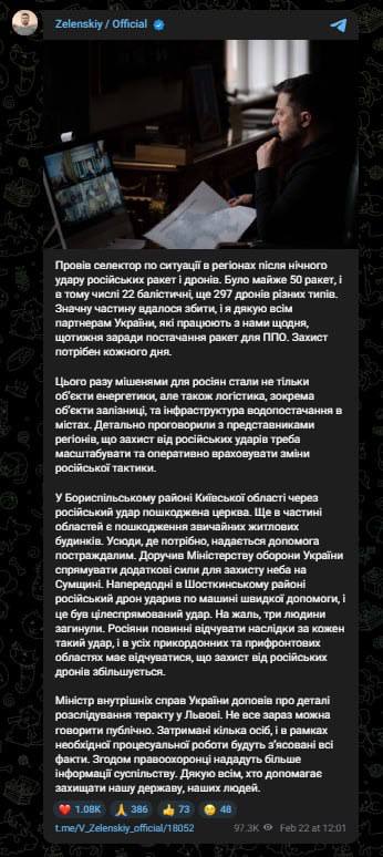 10:18 Украину ночью атаковли почти 300 ударных дронов и 50 ракет разных типов, значительная часть которых является баллистическими. Об этом заявил Зеленский.