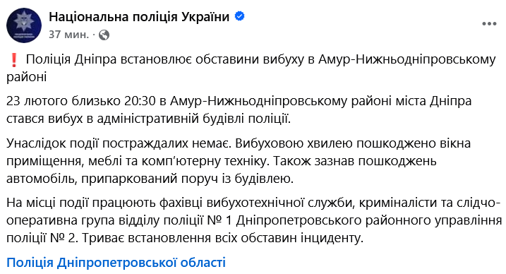 Позже в Нацполиции опубликовали подробности о взрыве в одном из полицейских отделений Днепра.