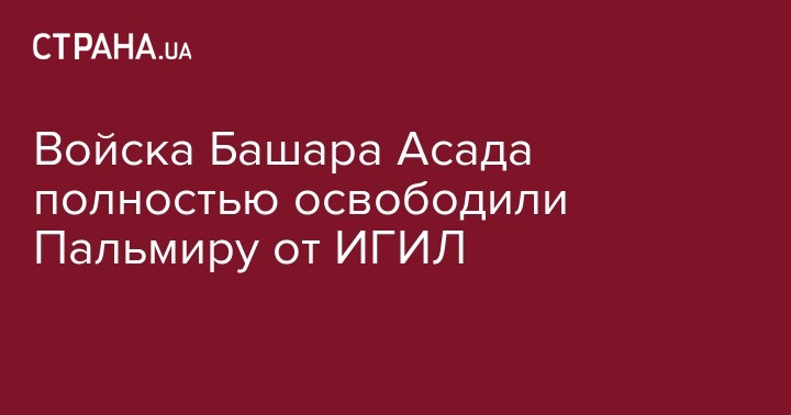 Сирийские правительственные войска полностью освободили город Пальмира (215 км от Дамаска) от боевиков "Исламского государства". Об этом сообщает агентство AFP со ссылкой на военный источник.