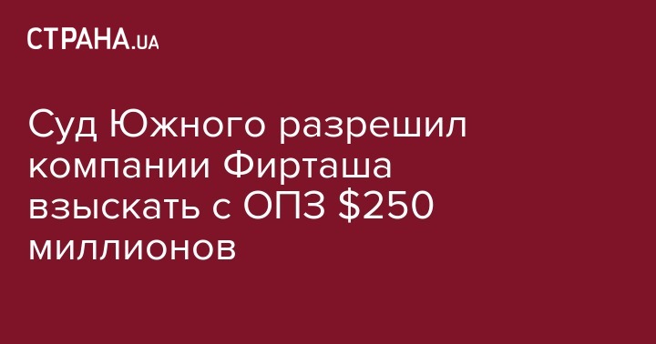 Городской суд города Южное Одесской области от лица Украины признал решение Арбитражного института Торговой палаты Стокгольма о взыскании с Одесского припортового завода (ОПЗ) $250 миллионов (около 6,8 млрд. грн.) в пользу компании "Ostchem". Ее владельцем считается Дмитрий Фирташ.