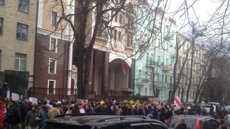 В Киеве под посольством Белоруссии проходит акция в поддержку задержанных во время Дня Воли 25 марта. Об этом сообщает телеканал "112 Украина".