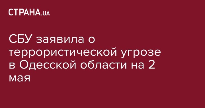В Службе безопасности Украины заявили, что накануне годовщины событий 2 мая в Одессе и области ожидается высокий уровень террористической угрозы. Об этом сообщает УНН.