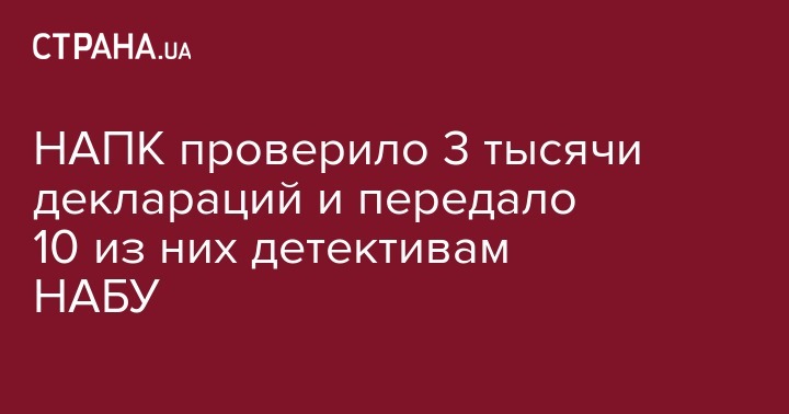 Заместитель главы Национального агентства по вопросам предотвращения коррупции Руслан Радецкий заявил, что ведомство завершило проверку около 3 тыс. электронных деклараций, 10 передано в Национальное антикоррупционное бюро Украины (НАБУ). Об этом сообщает "Интерфакс-Украина".