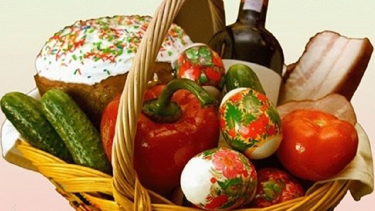 В пасхальную корзину "положили" по килограмму домашней буженины и колбасы, две бутылки Кагора (украинский и молдавский), кулич на 0,5 кг, пачку сливочного масла 200 гр, 0,5 кг российского сыра, четверть килограмма хрена, 1 кг соли, десяток яиц и пачку церковных свечей.