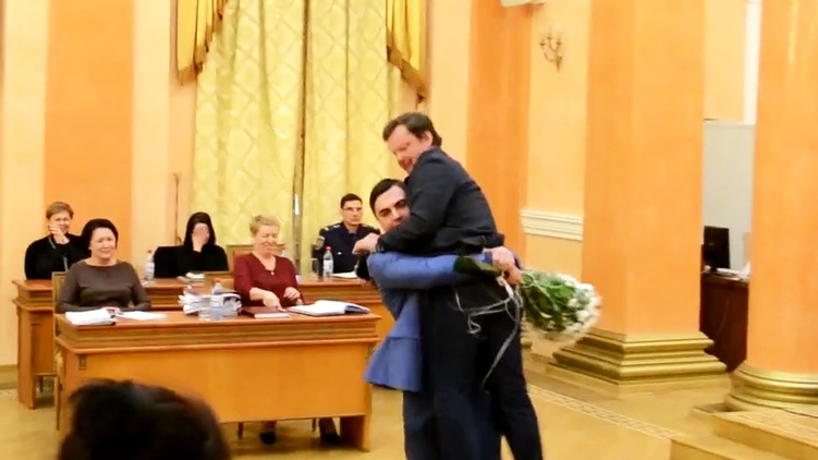 "Саша сидел на руках спокойно и не выражал желания отказаться от первоначального плана. При выходе из зала я споткнулся о ногу журналиста (кажется, это было корреспондент "7 канала") и случайно выронил Сашу на пол".