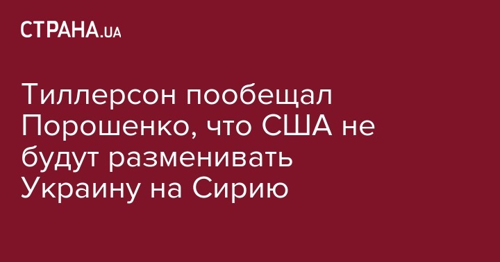 Госсекретарь США Рекс Тиллерсон сегодня во время телефонного разговора с Петром Порошенко накануне переговоров с Кремлем пообещал, что Вашингтон считает недопустимыми пакетные договоренности по разрешению ситуации в Украине и Сирии. Об этом сообщает пресс-служба украинской АП.