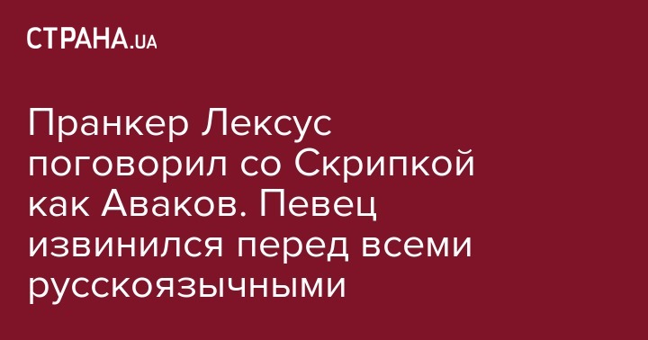 Известный пранкер Андрей Столяров (по прозвищу Лексус) позвонил Скрипке и представился главой МВД Аваковым. Украинский певец на русском языке объясняется перед псевдоминистром за неудачную шутку-рекомендацию отправлять в ссылку всех неспособных к изучению украинского языка. Говорит, что это анекдот. А еще выяснилось, что Скрипка хочет в Общественный совет при МВД.