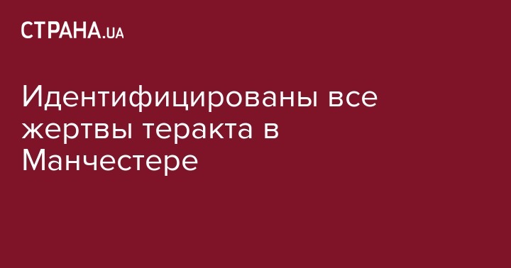 Полиция Манчестера заявила, что идентифицировала личности всех 22 погибших в результате теракта, произошедшего 22 мая во время музыкального концерта на "Манчестер Арене". Об этом говорится в заявлении ведомства в Twitter.