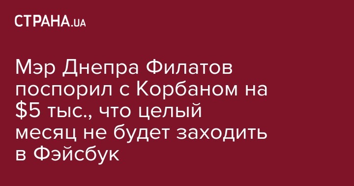Мэр Днепра Борис Филатов выиграет на спор $5 тыс. у председателя Днепропетровской областной организации партии УКРОП, бизнесмена Геннадия Корбана, если месяц продержится без социальных сетей.