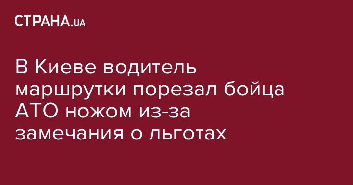 В Киеве водитель маршрутки ранил ножом бойца АТО за замечание после отказа в льготном проезде пенсионеру. Об этом на своей странице в Facebook сообщила пользователь Мария Саврун.