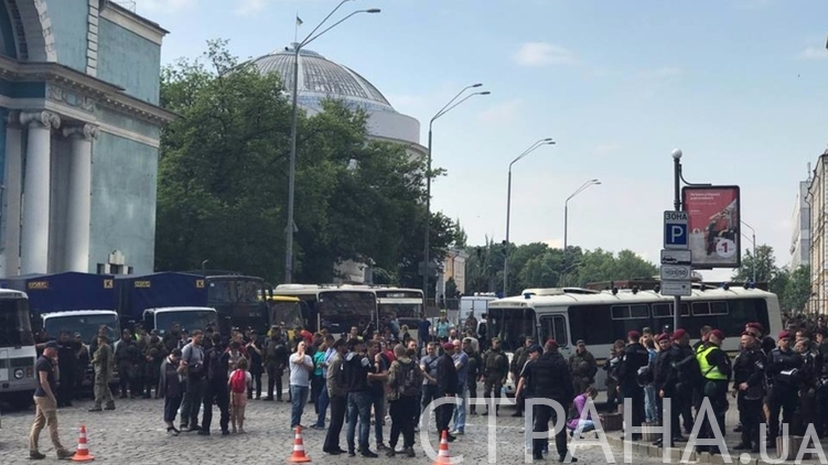 Протесты шли еще до начала марша. Радикалы перекрыли Владимирскую около Красного корпуса и атаковали полицейскую конницу. Из-за этого инцидента в МВД оперативно решили изменить маршрут КиевПрайда.