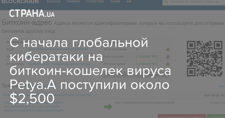 Спустя пять часов после масштабной вирусной атаки по всему мира, На биткоин-кошелек, связанный с вирусом "Petya.A" были переведены свыше $2,5 тысяч, согласно открытой информации блокчейна.