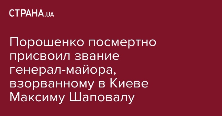 Сегодня, 30 июня, президент Украины Петр Порошенко посмертно присвоил звание генерал-майора погибшему в Киеве сотруднику Главного управления разведки Министерства обороны Украины Максиму Шаповалу.