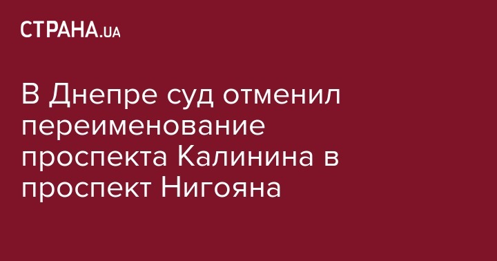 Апелляционный административный суд Днепра отменил решение городского совета о переименовании проспекта Калинина в проспект Сергея Нигояна, одного из героев Небесной сотни. Об этом "Радио Свобода", ссылаясь на информацию жителей города, которые были против переименования и обратились с иском в суд.