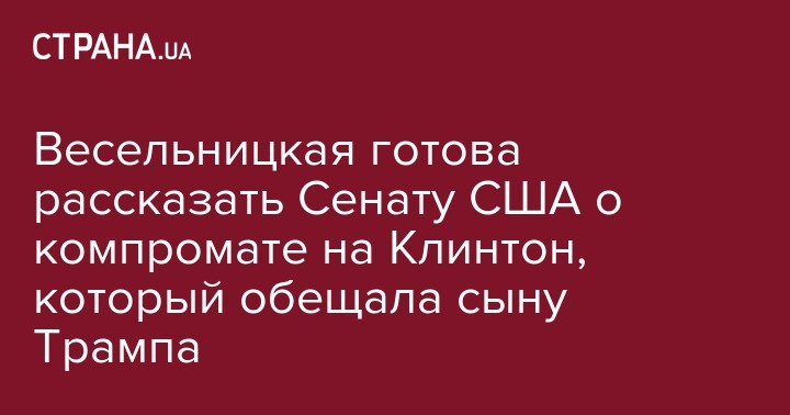 "Адвокат Наталия Весельницкая, после встречи с которой сына Дональда Трампа заподозрили в готовности принимать помощь иностранного государства ради победы отца на президентских выборах, готова дать показания в Сенате конгресса США или через адвокатов. По ее словам, она готова прояснить ситуацию "исключительно в правовом поле", готова поехать в США, если ей будет обеспечена безопасность", - говорится в сообщении.
