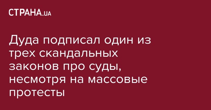 Президент Польши Анджей Дуда подписал один из трех законов о реформе судопроизводства, из-за которых в Польше проходят массовые протесты. Об этом сообщил заместитель главы президентской канцелярии Павел Муха, передает "Польское радио".