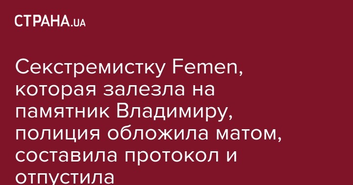 На активистку Femen Анну Аляйн, которая сегодня взобралась на памятник Владимиру Крестителю, в Шевченковском райотделе полиции составили административный протокол и отпустили. Об этом сообщает корреспондент "Страны" с места событий.