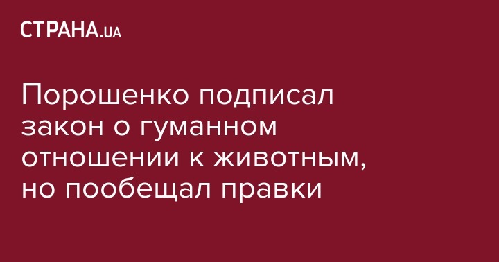 Президент Украины Петр Порошенко подписал закон "О внесении изменений в некоторые законодательные акты Украины относительно внедрения гуманного отношения к животным", при этом ввиду выявленных в документе недостатков ряда положений направил в Кабмин предложения по усовершенствованию отдельных положений законодательных актов с учетом внесенных этим законом изменений.