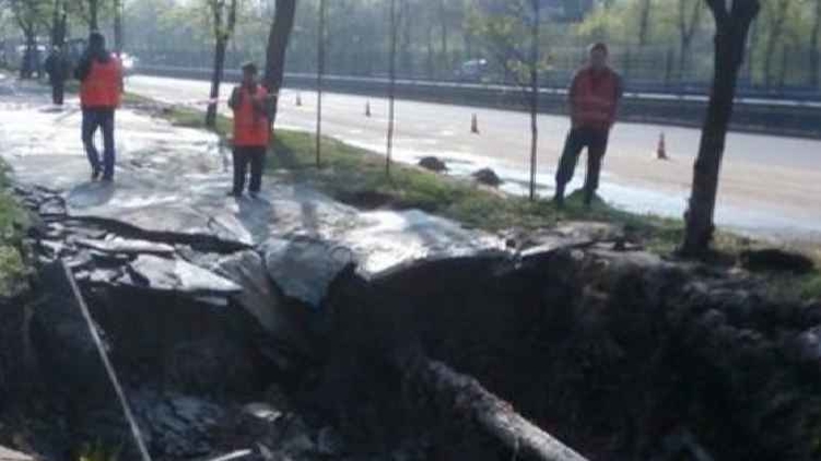 Из-за аварии в тротуаре образовалась яма размером 5 на 5 метров, которая заполнена водой. Последствия аварии ликвидирует рабочая бригада ДЭУ Соломенского района.