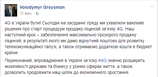 "Наш следующий шаг - обеспечение максимально прозрачную продажу лицензий, в результате чего мы дадим ощутимый толчок для развития телекоммуникационной отрасли, а также получим дополнительные средства в бюджет страны", - пишет Гройсман.
