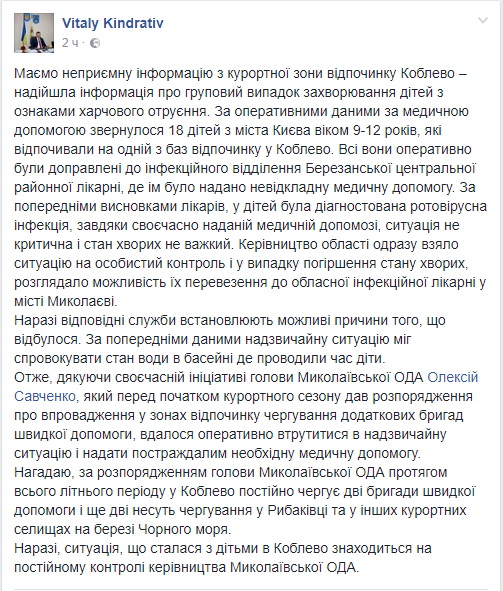 На одной из баз в Коблево Николаевской области восемнадцать детей из Киева госпитализированы с признаками пищевого отравления. Врачи диагностировали у детей ротавирусные инфекции. Об этом сообщил заместитель председателя Николаевской ОГА Виталий Кондратов в Facebook.