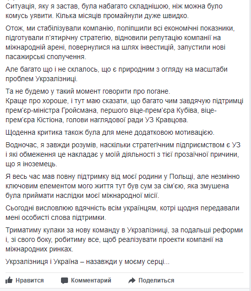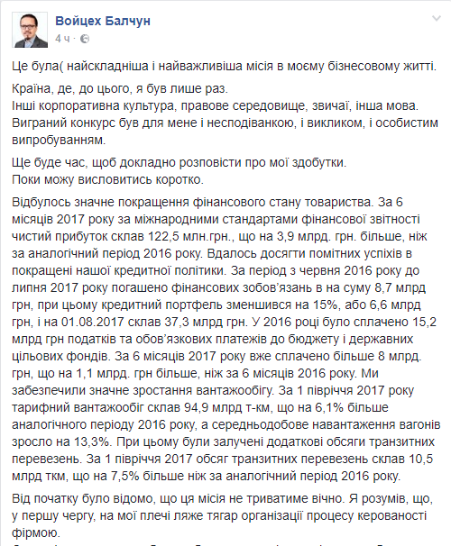 Теперь уже бывший глава "Укрзализныци" поляк Войцех Балчун прокомментировал свою отставку. Судя по его записи в Facebook, она связана с желанием Балчуна снова проводить время с семьей.