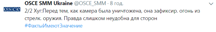 Позднее Хуг сообщил, что еще одна камера (менее мощная) повреждена во время нападения на техническое оснащение СMM. "Она уже отремонтирована и работает", - сказано в сообщении СММ ОБСЕ в Твиттере. При этом не указано место расположения камеры.