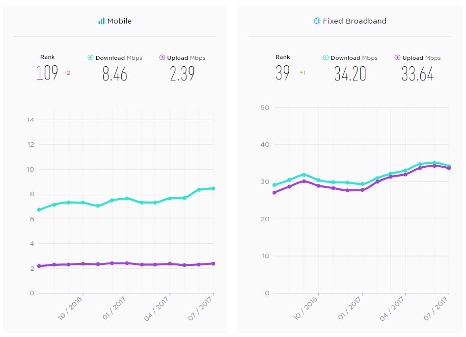 Speedtest представил свой Global Index, который анализирует скорость мобильного и фиксированного широкополосного интернета во всем мире. По скорости мобильного интернета Украина находится внизу рейтинга - на 109 месте из 122 стран, присутствующих в рейтинге.