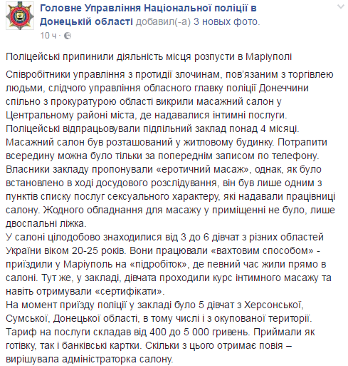 В салоне круглосуточно находились от 3 до 6 девушек из разных областей Украины в возрасте 20-25 лет. Они работали по "вахтовому методу" - приезжали в Мариуполь на "подработку" и некоторое время жили прямо в салоне. Здесь же девушки проходили курс интимного массажа и даже получали "сертификаты".