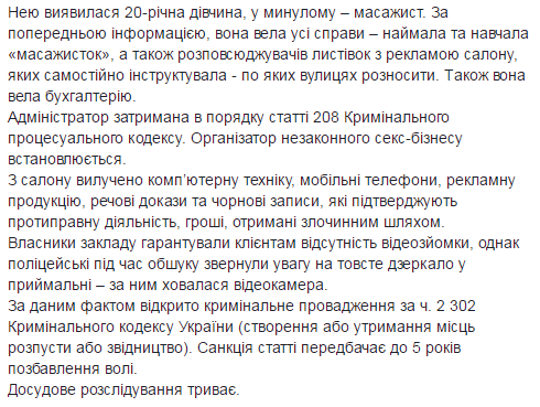 На момент приезда полиции в "салоне" было 5 девушек из Херсонской, Сумской, Донецкой области, в том числе из оккупированной территории. Тариф на услуги составлял от 400 до 5000 грн, принимали наличные средства и банковские карты. Администратором салона оказалась 20-летняя девушка, в прошлом – массажист, она нанимала и учила "массажисток", а также вела бухгалтерию.