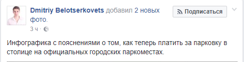 Советник мэра Киева по вопросам благоустройства Дмитрий Белоцерковец опубликовал в Facebook инфографику-инструкцию по безналичной оплате парковки в столице.
