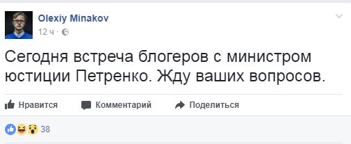 "Сегодня встреча блогеров с министром юстиции Петренко. Жду ваших вопросов", - написал он.