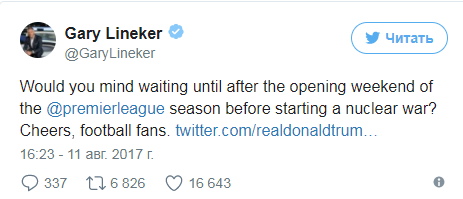 "Не могли бы вы подождать с ядерной войной до старта сезона премьер-лиги? Будьте здоровы, футбольные болельщики", – написал в ответ Линекер.