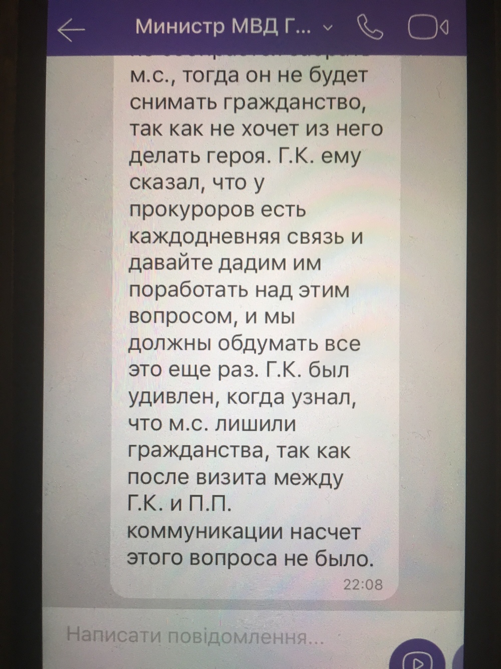 Пранкеры также показали нам переписку с министром внутренних дел Грузии, который уточнил некоторые детали по поводу переговоров Петра Порошенко (обозначен как П.П.) и премьер-министра Грузии Георгия Квирикашвили (Г.К.) насчет Саакашвили.