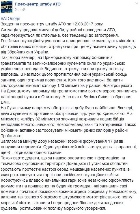 В частности, вечером в субботу, на Приморском направлении участники незаконных военизированных формирований из гранатометов и крупнокалиберных пулеметов вели огонь по укреплениям украинских воинов неподалеку от Водяного, получая при этом жесткий ответ. В результате противостояния один украинский боец ​​погиб. Кроме того, уже ночью сепаратисты применили миномет калибра 120 миллиметров в районе Новотроицкого.