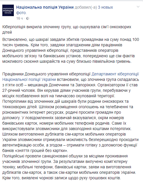 Донецкое управление киберполиции разоблачило преступную группу из пяти человек, которые воровали деньги с банковских счетов онкобольных детей. Об этом сообщает пресс-служба полиции в Facebook.
