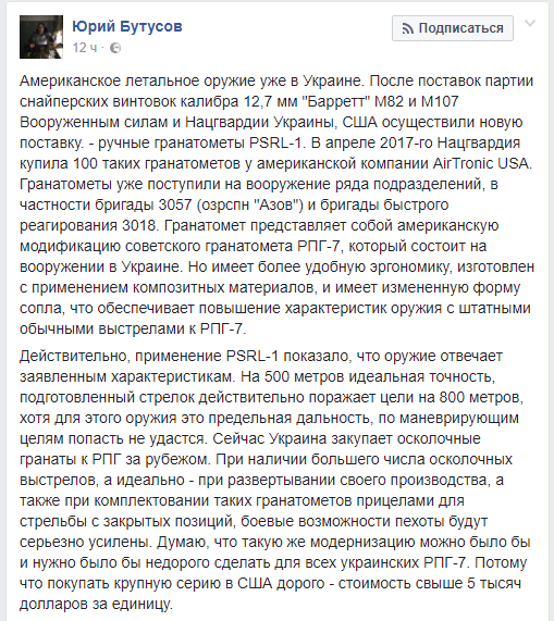 "Гранатомет представляет собой американскую модификацию советского гранатомета РПГ-7, который состоит на вооружении в Украине. Применение PSRL-1 показало, что оружие отвечает заявленным характеристикам. На 500 метров идеальная точность, подготовленный стрелок действительно поражает цели на 800 метров, хотя для этого оружия это предельная дальность, по маневрирующим целям попасть не удастся", - пишет Бутусов.