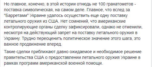 "Но главное, конечно, в этой истории отнюдь не 100 гранатометов - поставка символическая, на самом деле. Главное, что вслед за "Барретами" Украине удалось осуществить еще одну поставку летального оружия из США. Нет сомнений, что американские контролирующие органы сделку зафиксировали, однако не отменили, несмотря на действующий запрет на поставку летального оружия в Украину", - пишет журналист.