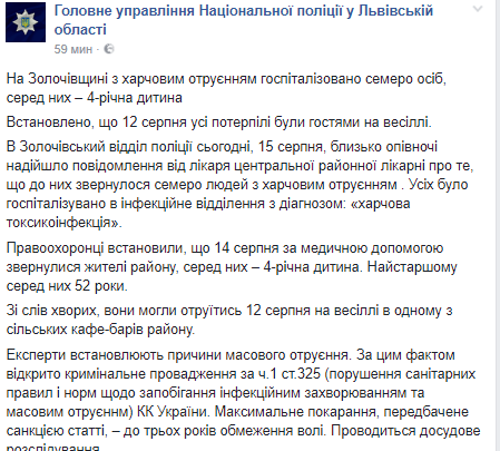 "Эксперты устанавливают причины массового отравления. По данному факту открыто уголовное производство по ч. 1 ст. 325 (нарушение санитарных правил и норм относительно предотвращения инфекционных заболеваний и массовых отравлений) УК Украины", - говорится в сообщении полиции.