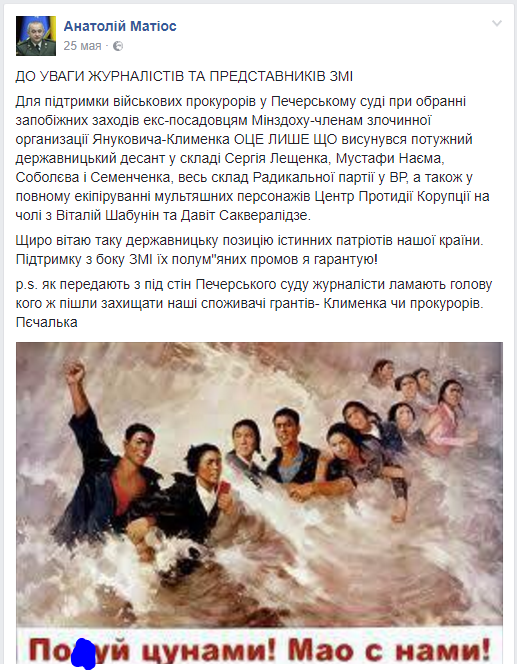 Речь идет о посте от 25 мая, в котором Матиос рассказал про аресты налоговиков по делу "клименковцев". К посту он прикрепил картинку стоящих в шторм в воде китайцев с подписью: "По*уй цунами! Мао с нами!".