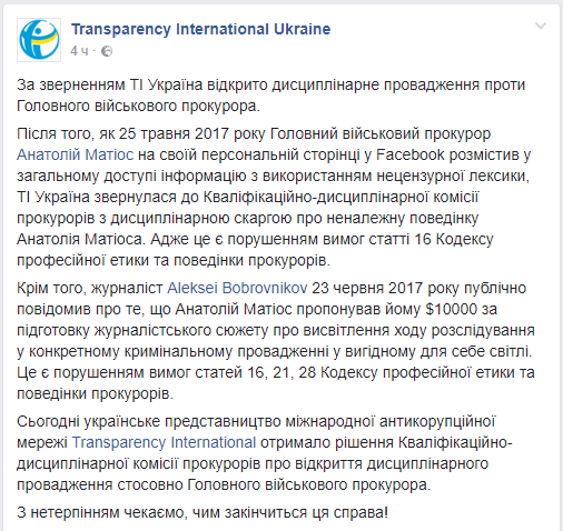 Transparency увидело картинку и подало в квалификационно-дисциплинарную комиссию прокуроров дисциплинарную жалобу о ненадлежащем поведении Матиоса.